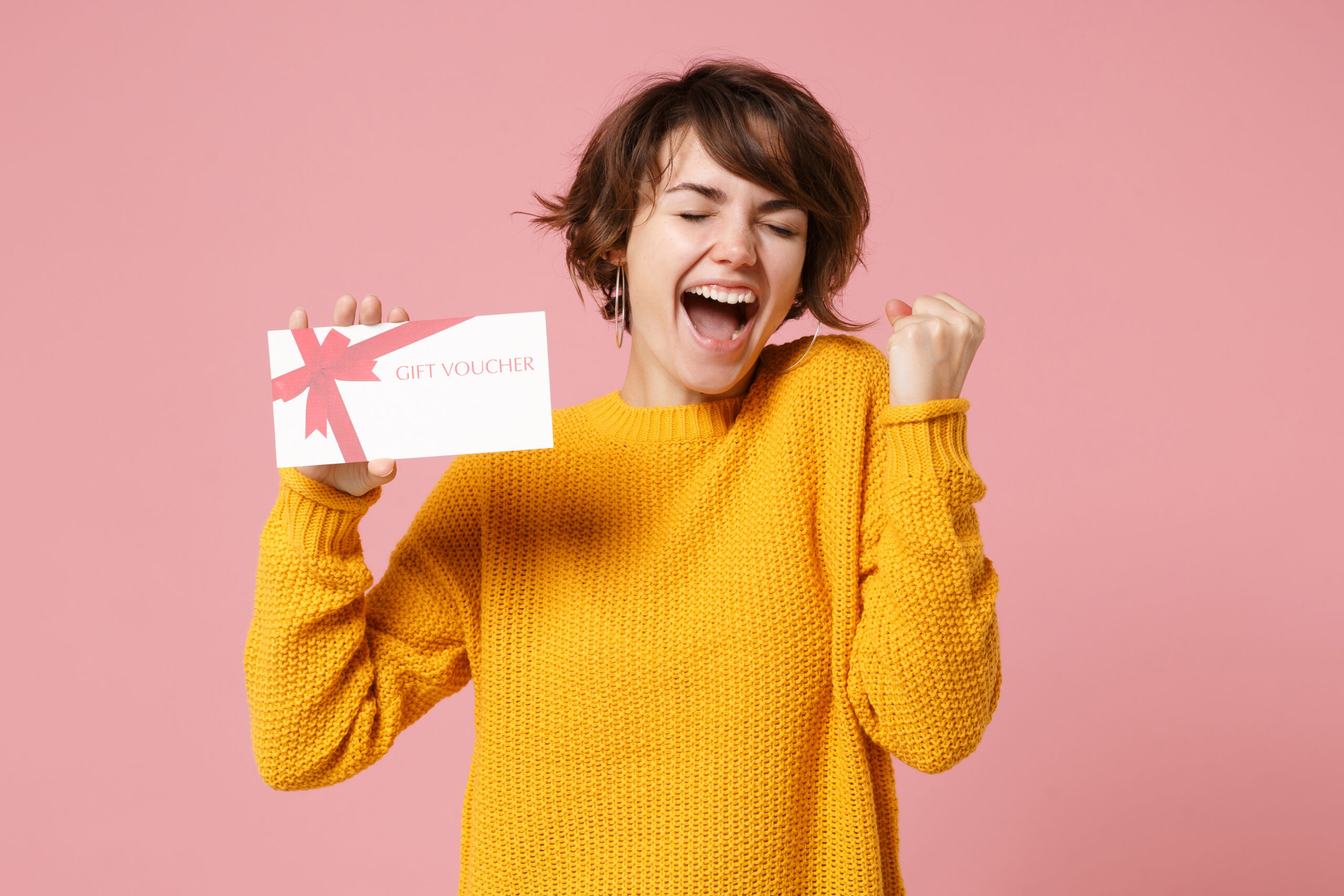 Joyful young brunette woman girl in yellow sweater posing isolated on pastel pink background studio portrait. People lifestyle concept. Mock up copy space. Hold gift certificate, doing winner gesture.